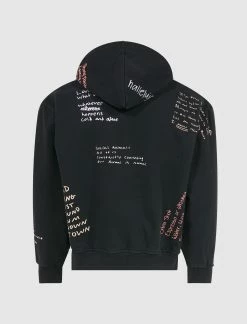 Pullover hoodie. Fixed hood. Graphic logo text at chest. Kangaroo pocket at front. Graphic text throughout. Ribbed cuffs and hem. – 65% Cotton, 35% Polyester SKU: P21W025-BLACK