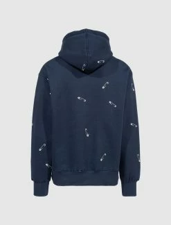 Pullover cotton hoodie. Fixed hood. Graphic logo text at chest. Kangaroo pocket at front. Safety pin graphic prints throughout. Ribbed cuffs and hem. – 100% Cotton SKU: P22W018-NVY
