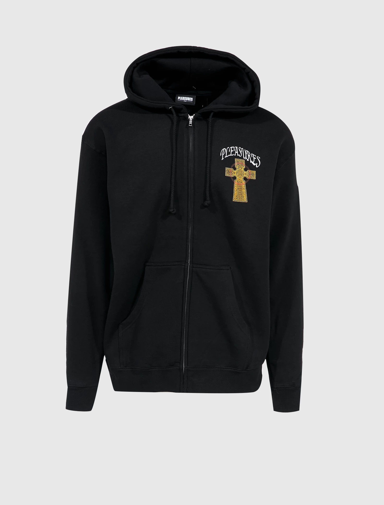 Zip up hoodie. Adjustable drawstrings at the hood. Logo printed at left chest. Graphic printed on the back. Front side pockets. Ribbed cuffs and hem. – Cotton SKU: P22SP058-BLACK