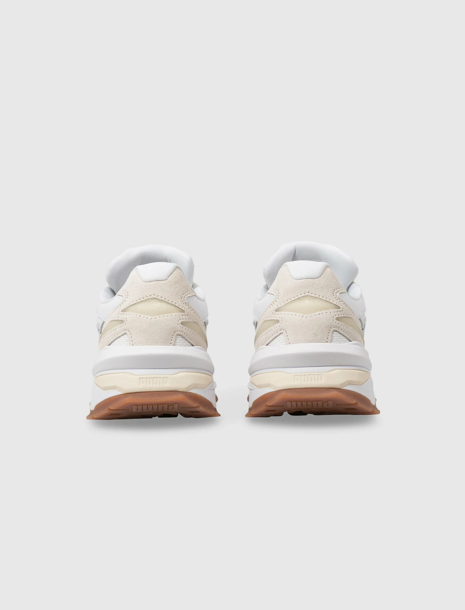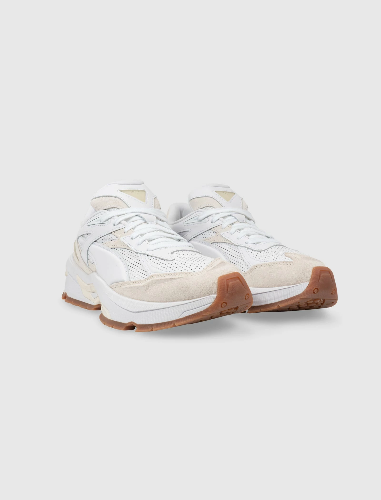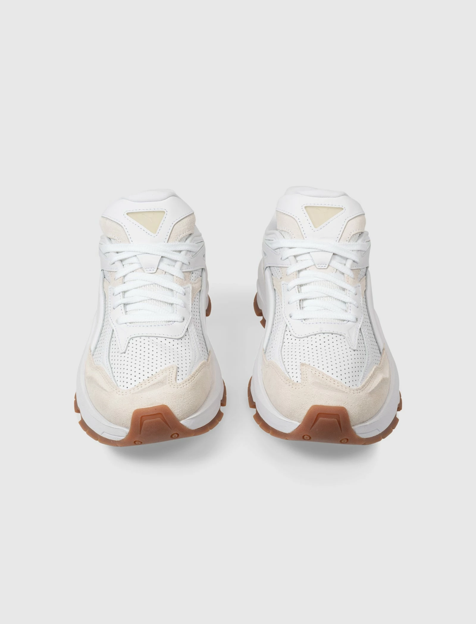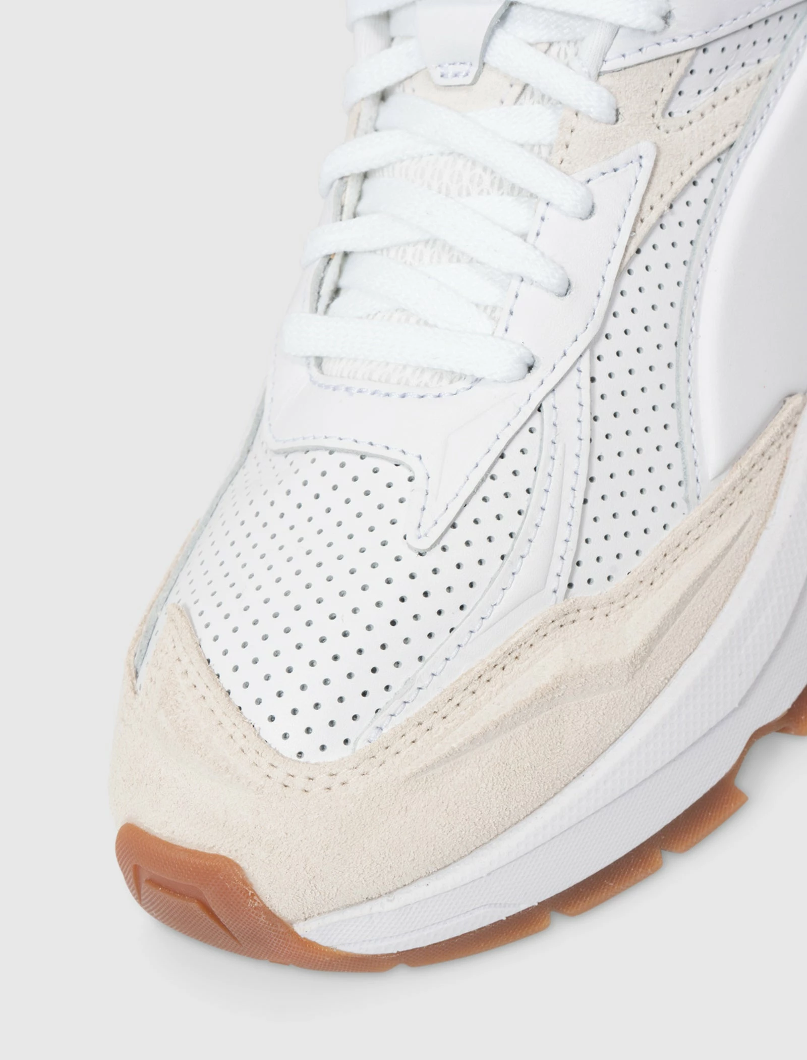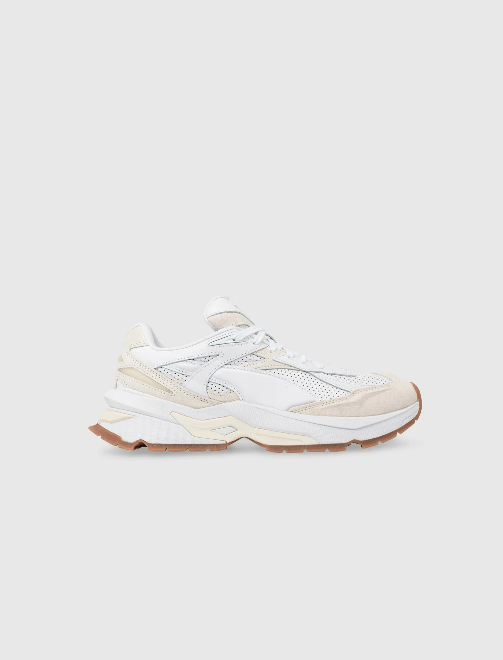 Low top sneakers. Perforated leather upper. Suede overlays around the toe, eyelet panels, and heel counter. Leather overlays around the eyelet panels, and collar. Front lacing. Padded leather tongue with suede accents. Leather logos stitched on the side panels. Thick rubber midsole. Rubber outsole. – Leather, and suede upper SKU: 38860901