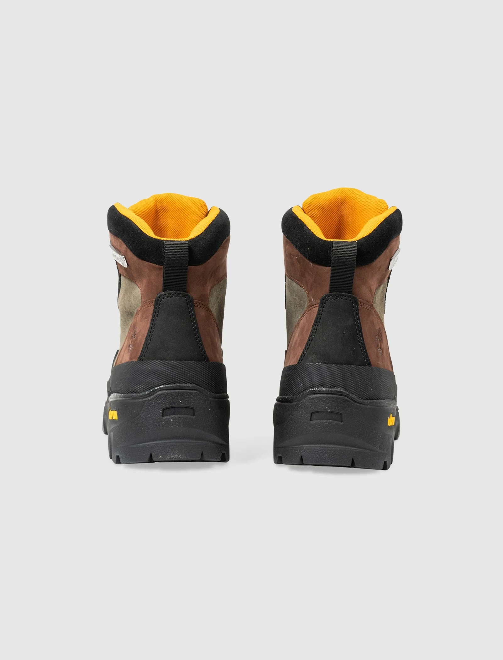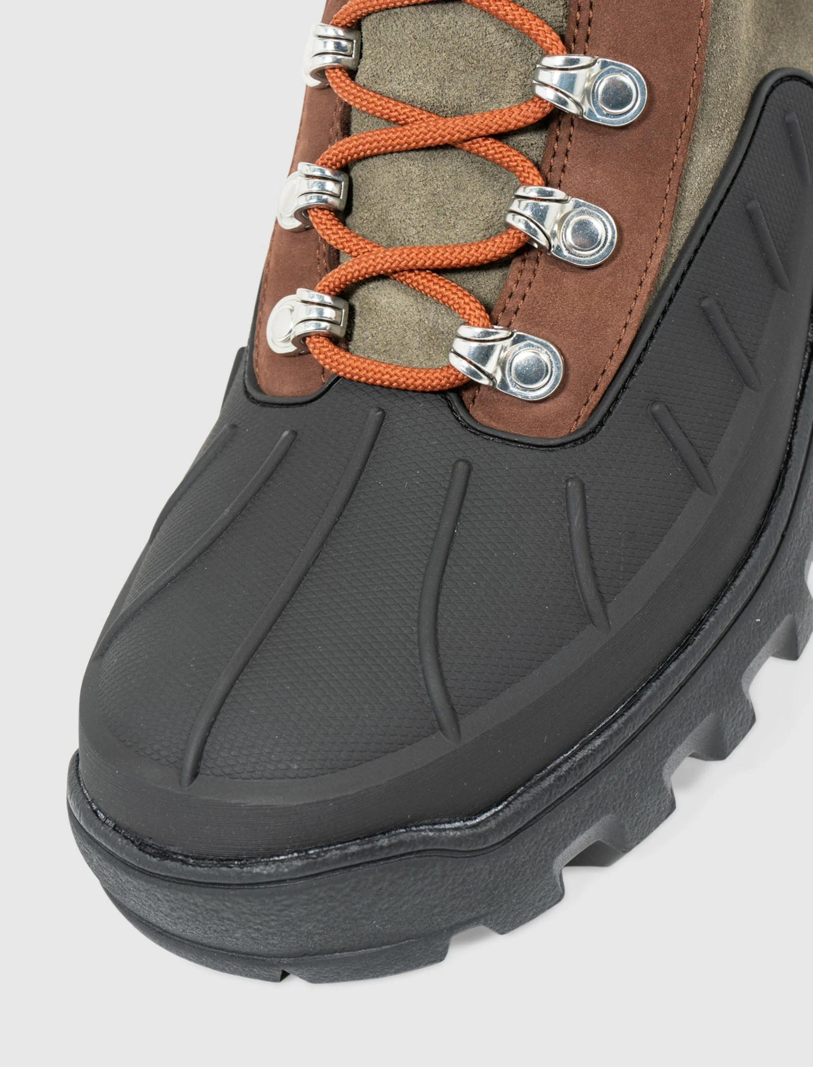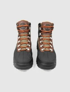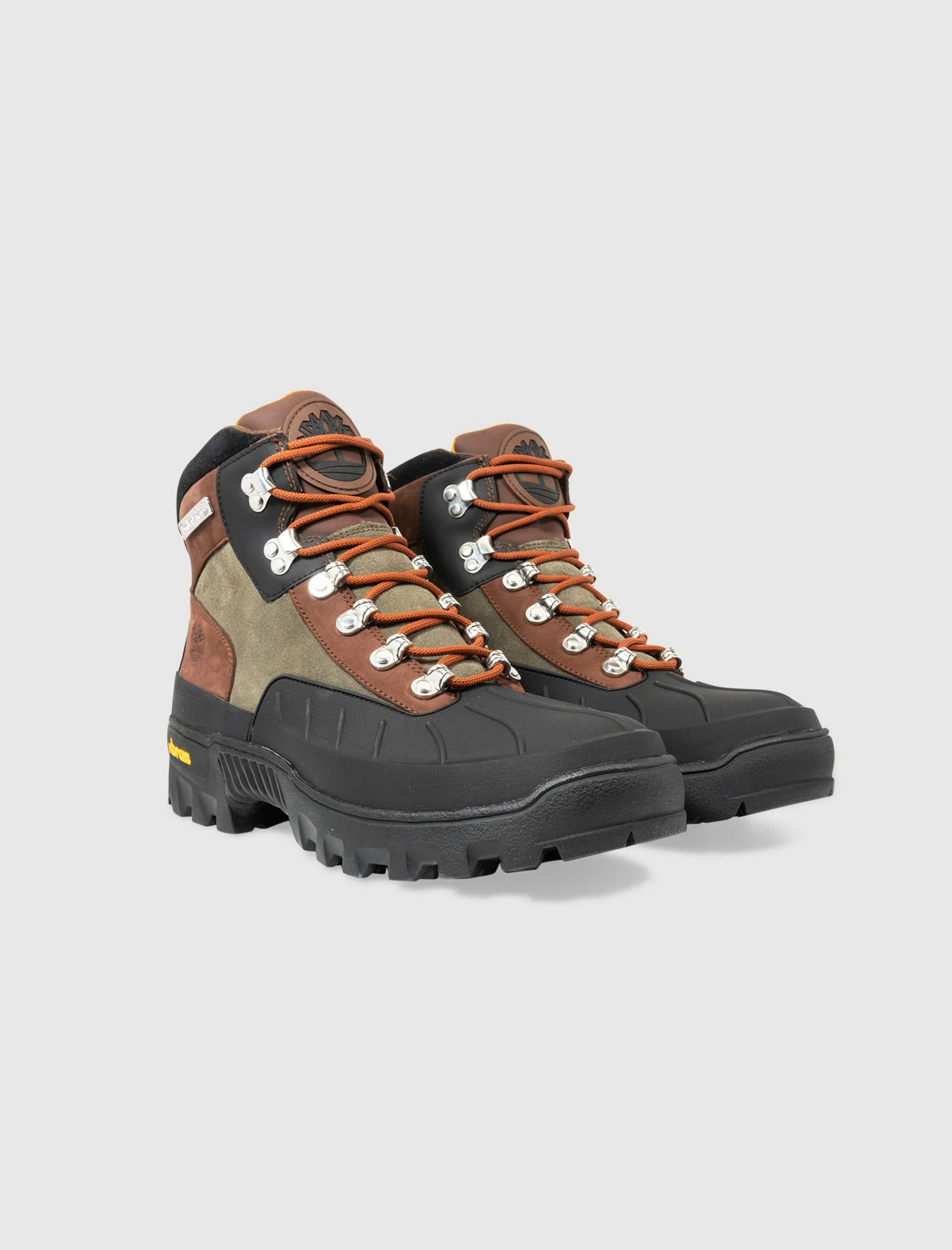 High top boots. Better Leather upper. Rubber mudguard around the toe, and front portion of the shoe. Leather overlays aorund the eyelet panels, collar, and heel counter. Metal lace eyelets with metal lace hooks at the collar. Leather tongue. Front lacing. Waterproof membrane. Vibram rubber lug outsole. – Better Leather waterproof upper SKU: TB0A5MD7931