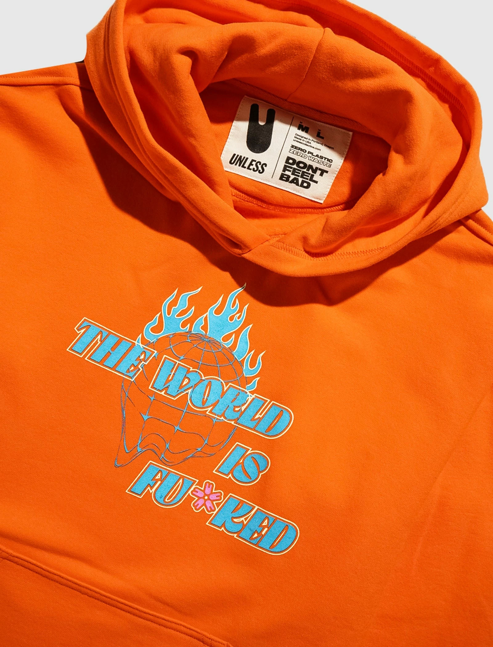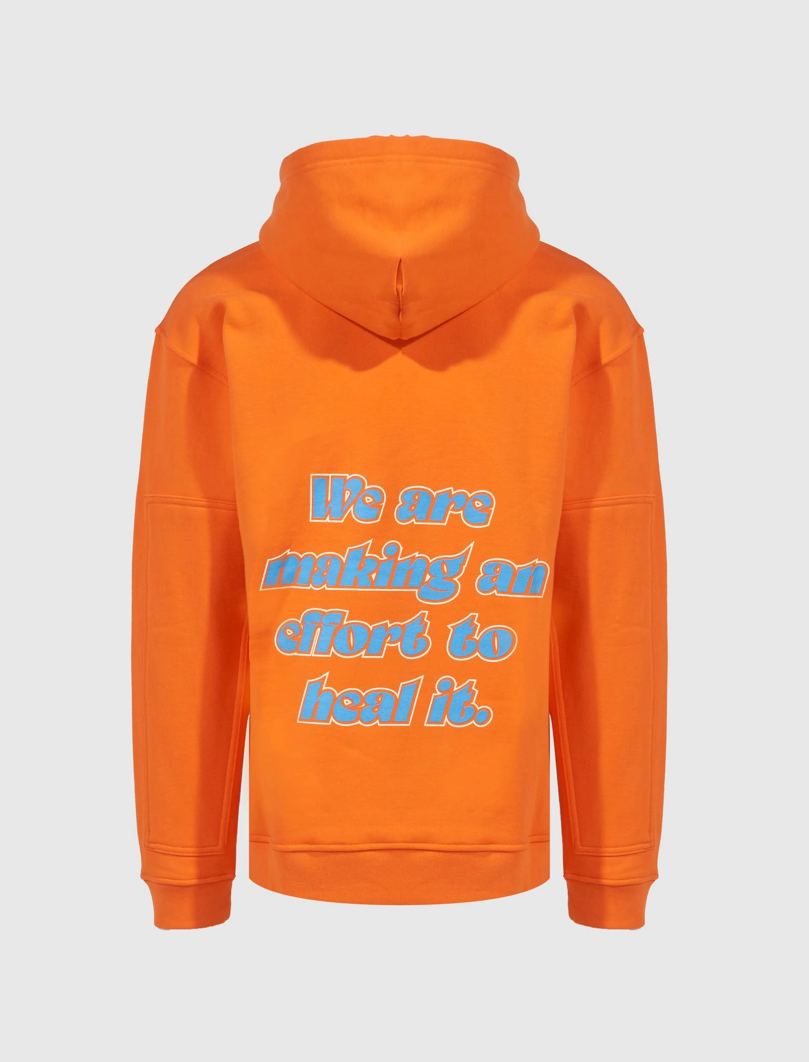 Pullover cotton hoodie. Fixed hood. Graphic text and print at chest and back. Kangaroo pocket at front. Ribbed cuffs and hem. – 100% Cotton SKU: ESS-HOODIE-ORG